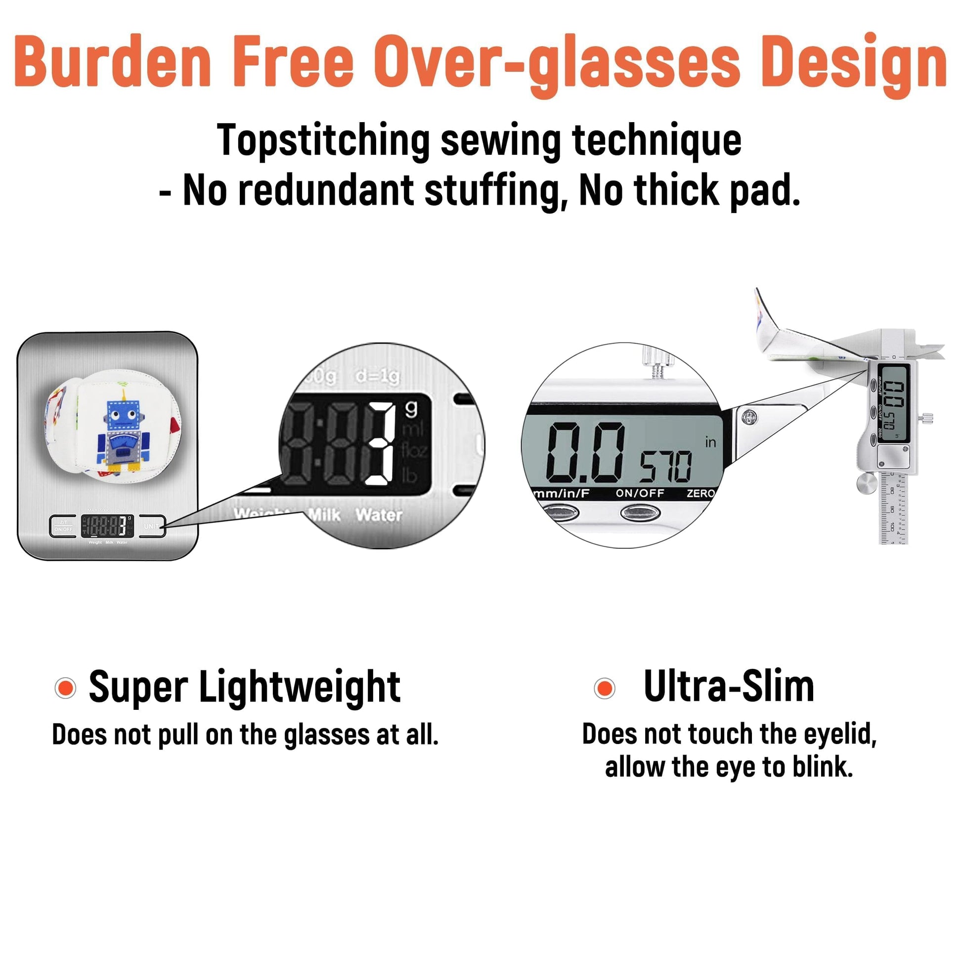 ✅ The burden-free over-glasses design is non-adhesive and does not cause any irritation to the eye. It does not pull on the glasses, and no thick pad touches the eyelid.