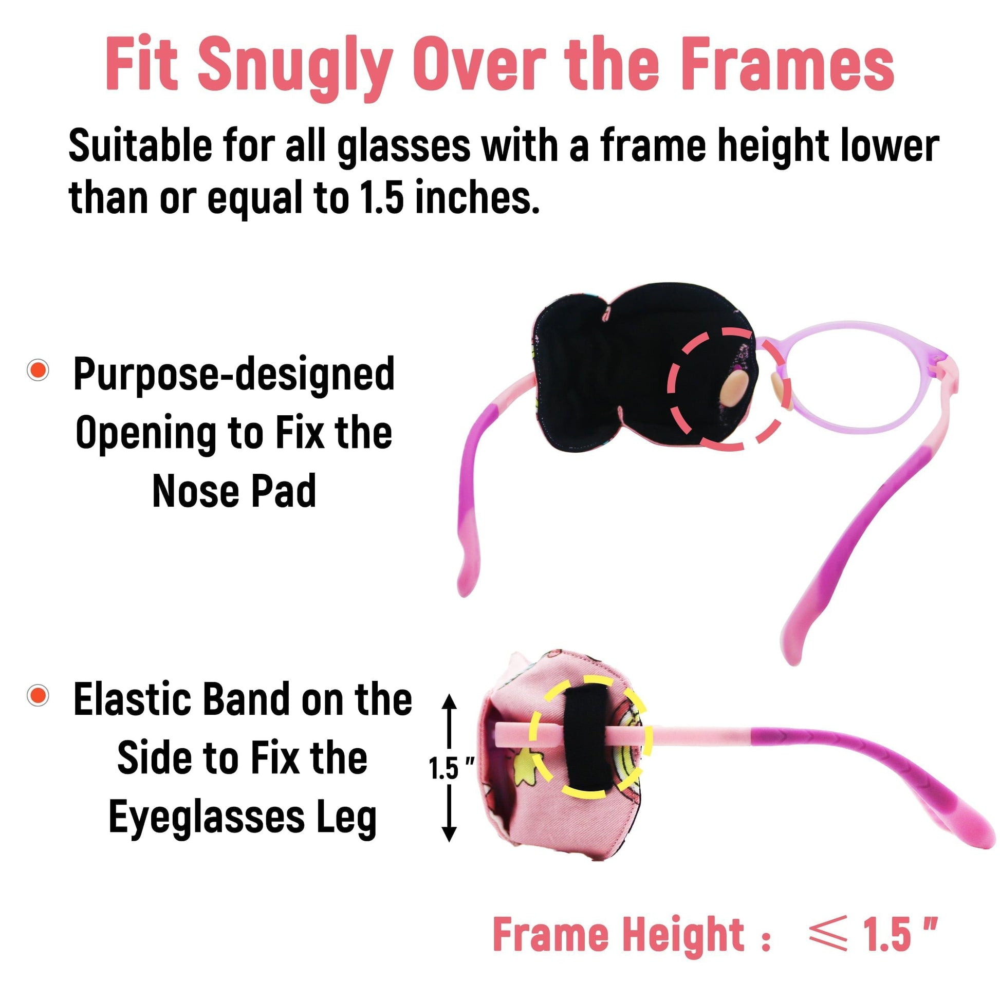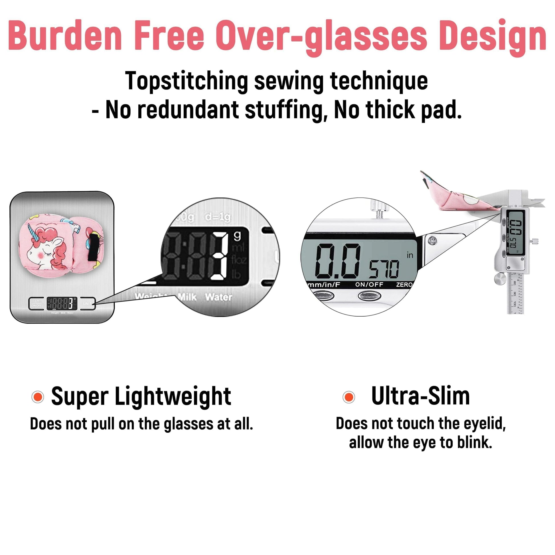 ✅ The burden-free over-glasses design is non-adhesive and does not cause any irritation to the eye. It does not pull on the glasses, and no thick pad touches the eyelid.