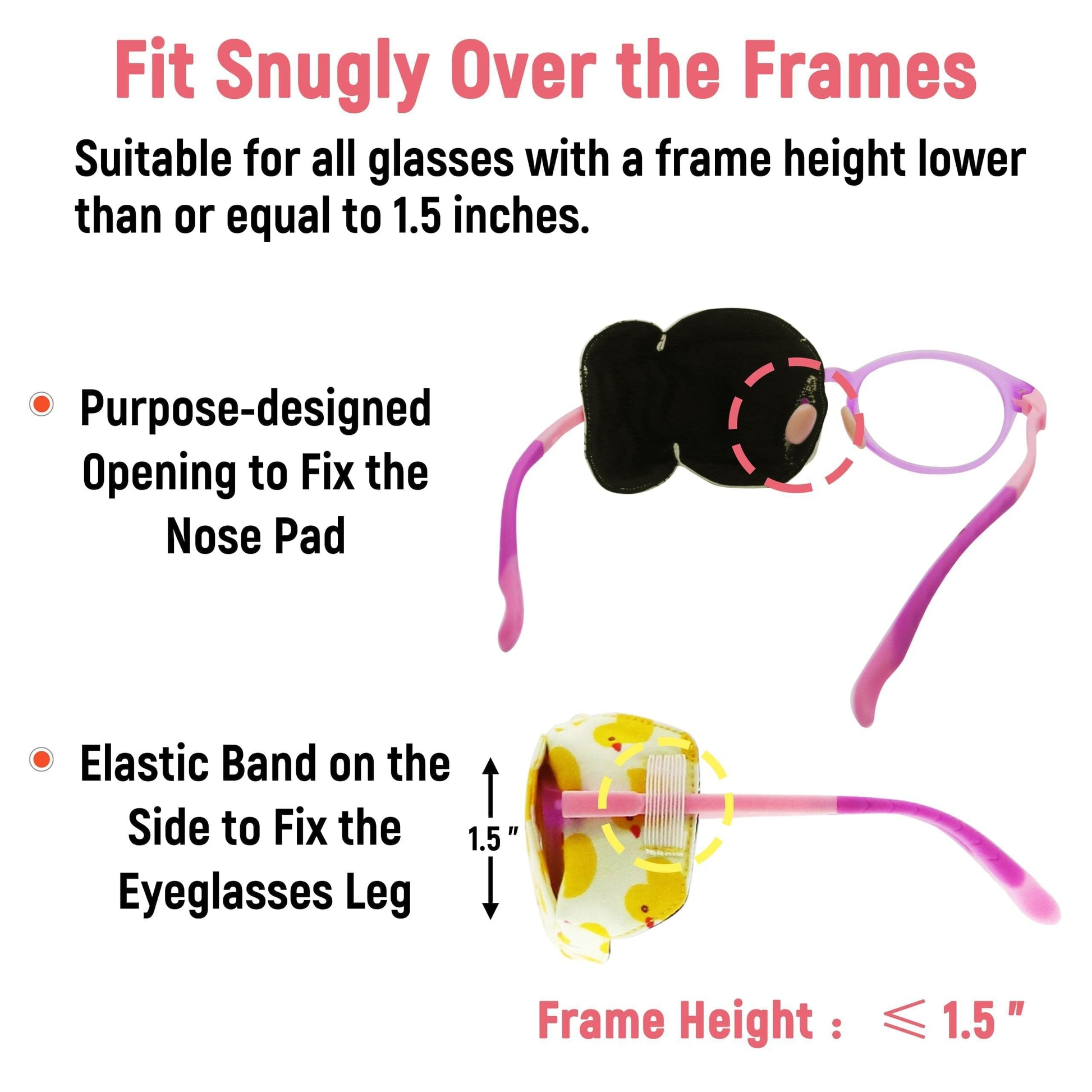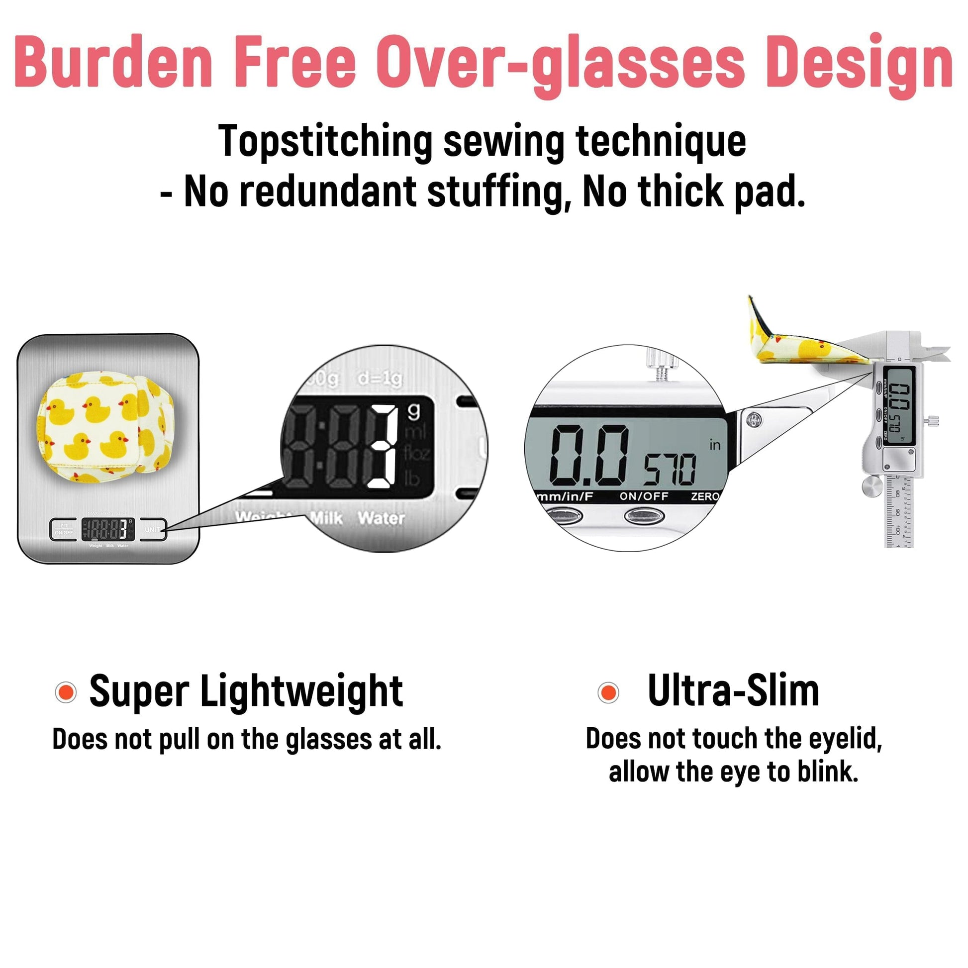 ✅ The burden-free over-glasses design is non-adhesive and does not cause any irritation to the eye. It does not pull on the glasses, and no thick pad touches the eyelid.